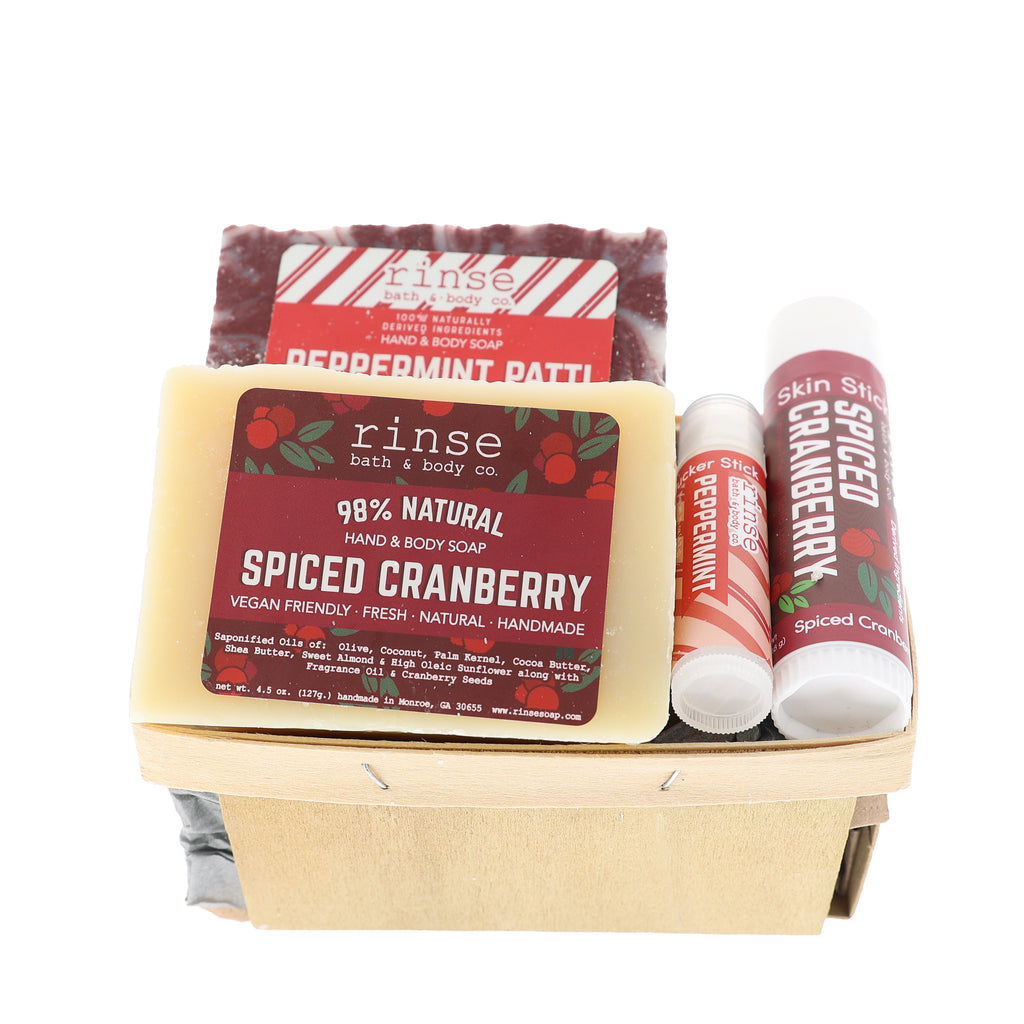 You'll receive a Peppermint Patti Soap, Spiced Cranberry Soap, a Spiced Cranberry Skin Stick, and a Peppermint Pucker Stick all packaged up in a sweet wooden berry till and tied up in a cello bag with a ribbon. One less thing for you to worry about!