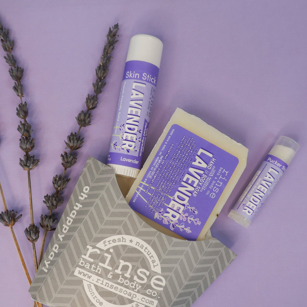 Lavender Fry Box Bundle is a curated set of complementary Rinse products. See the product listing for full contents. The perfect giftable bundle with a Soap, Skin Stick, & Pucker Stick! All in a cute Fry box, because who doesn't love fries?!