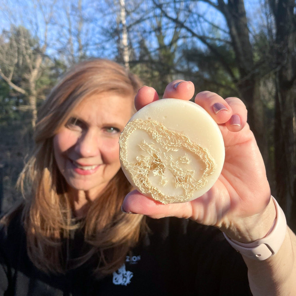 The natural loofah provides gentle exfoliation — much softer than synthetic scrubbers. If you have very sensitive skin, use lighter pressure and let the soap do the work. The moisturizing cold-process formula balances the exfoliation.