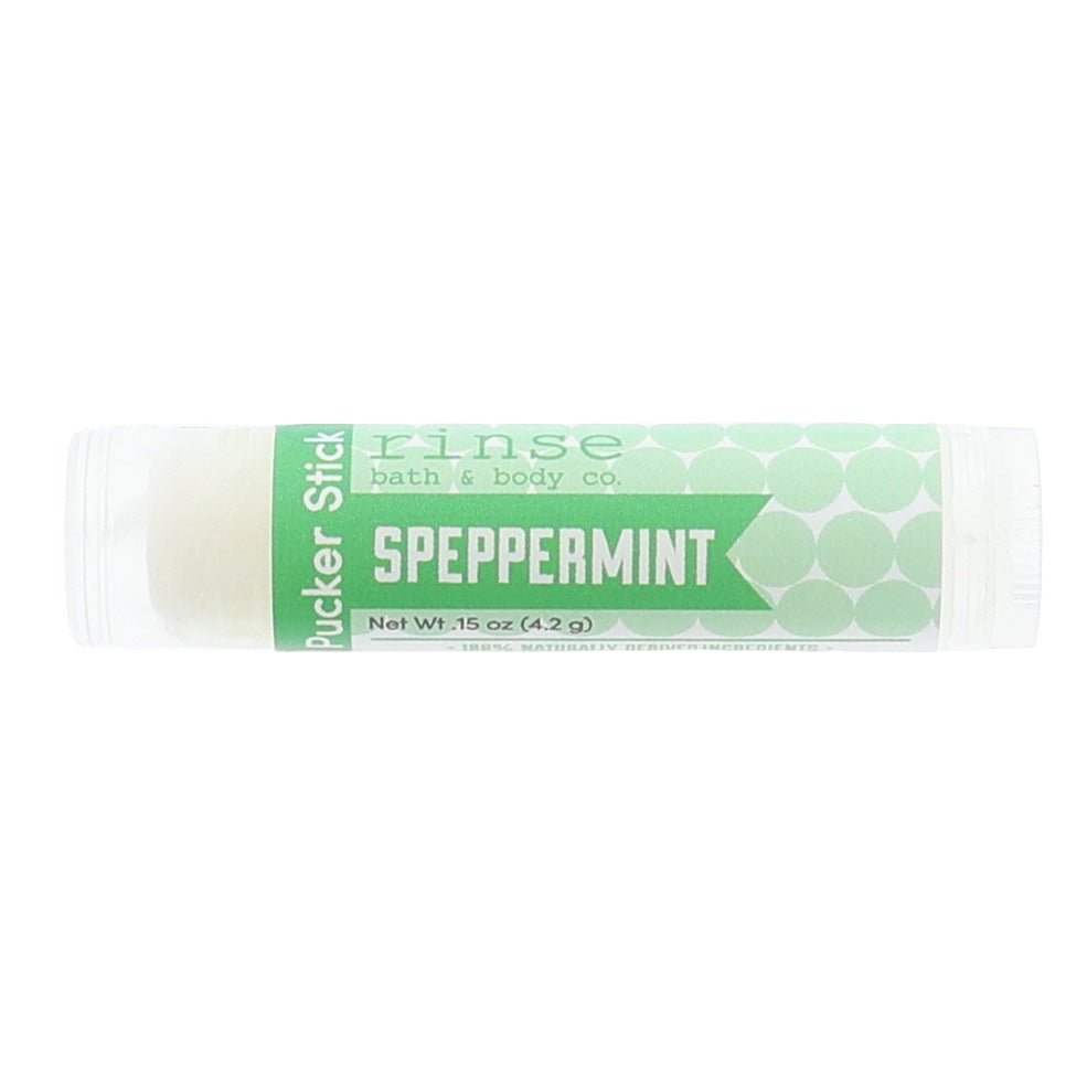 Rinse makes Spearmint Peppermint Pucker Stick with olive-derived squalane oil, apricot kernel oil, shea butter, and beeswax. No petroleum, no synthetics. The perfect combination of Peppermint & Spearmint Essential Oils will remind you of your favorite minty fresh gum! The two flavors play well together as the peppermint is a little warming & the spearmint is a little cooling! Deep hydration instead of a waxy layer.