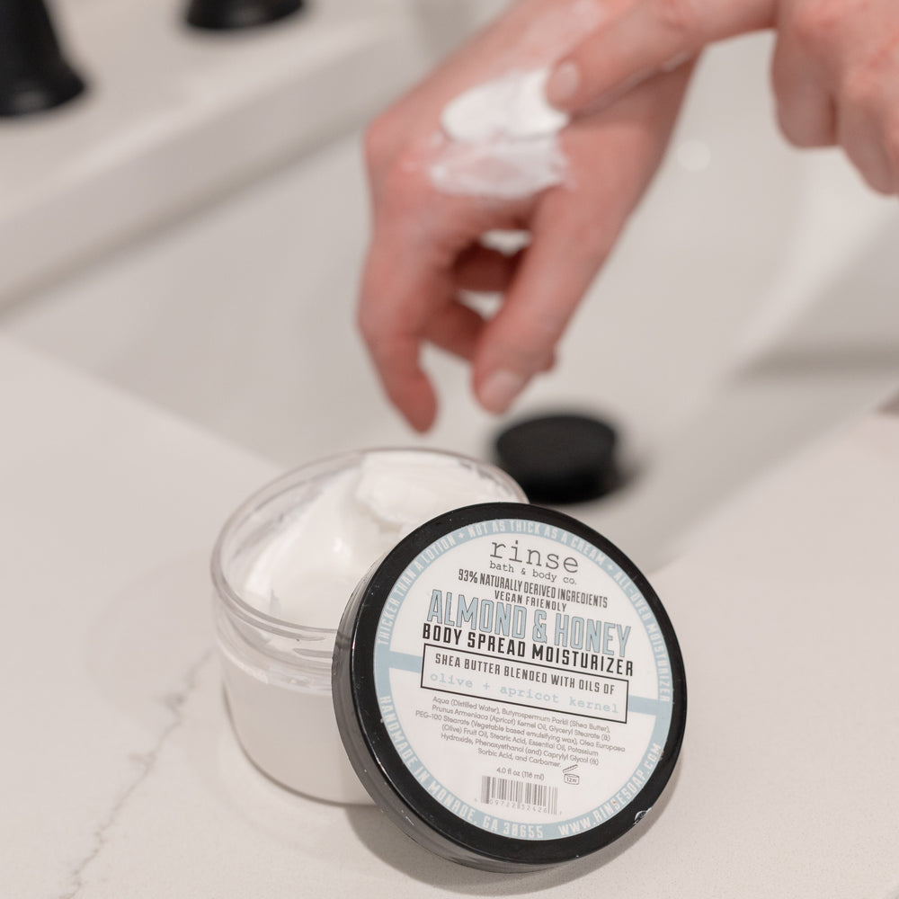 Treat your skin to rich, creamy moisture with our natural body lotion—known as Body Spread to the Rinse family. This jar features a beautiful warm almond and sweet honey scent and absorbs quickly without leaving greasy residue.