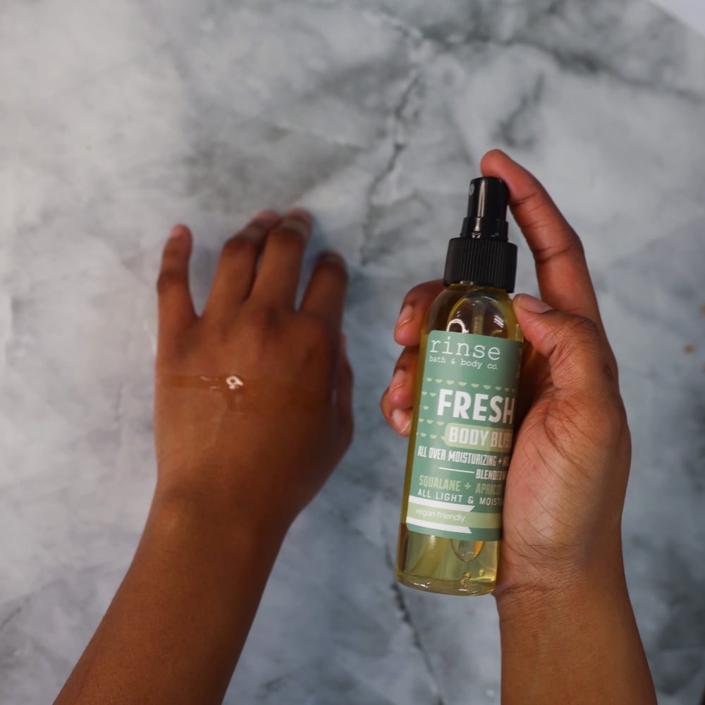 The squalane base in Fresh Fig Body Bliss absorbs fast — less transfer than traditional oils. Give it a minute before getting dressed. Any minimal residue comes out in a normal wash. Fresh Fig lightweight body oil. Absorbs fast, adds sheen without grease. Layer under lotion for extra moisture.