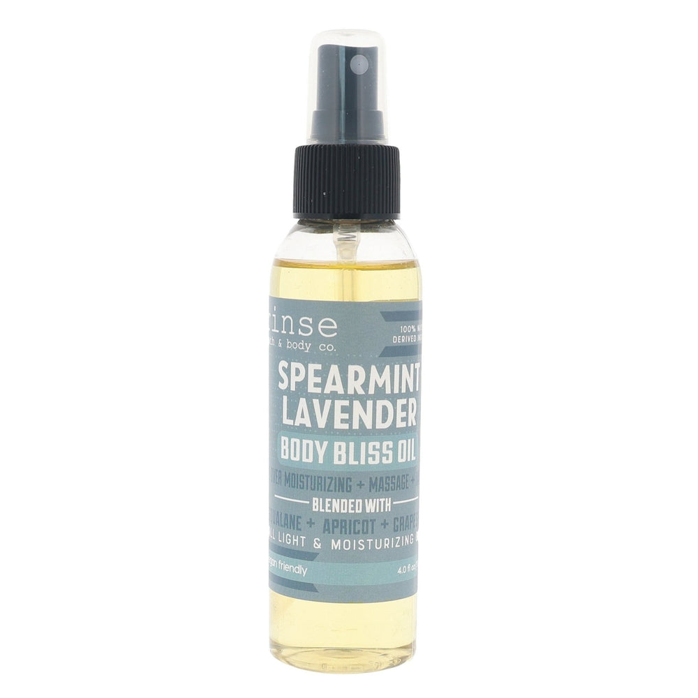Spearmint Lavender Body Bliss absorbs quickly — let it soak a minute before dressing. Any light residue washes out normally. The squalane base absorbs faster than traditional body oils. Spearmint Lavender lightweight body oil. Absorbs fast, adds sheen without grease. Layer under lotion for extra moisture.