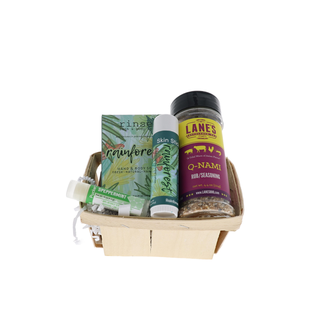Total island vibes. The tropical crossover — Rinse's Rainforest skincare trio packed into a wooden berry basket alongside Lane's Q-NAMI, the Asian-flavor rub that turns any grill night into a backyard luau.