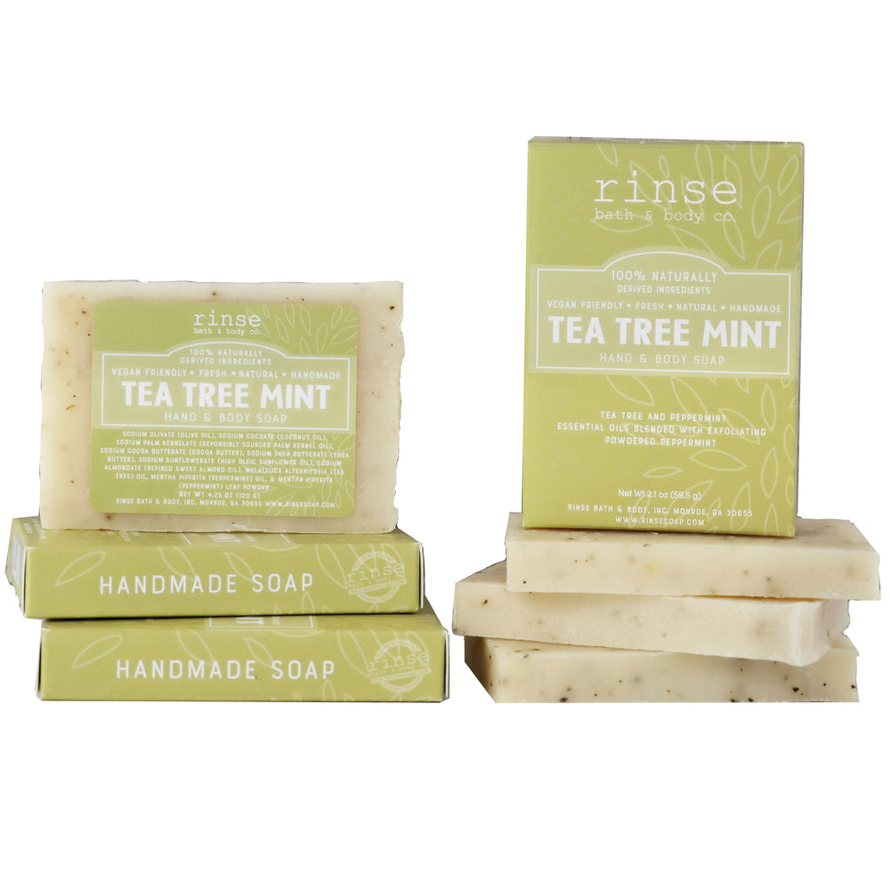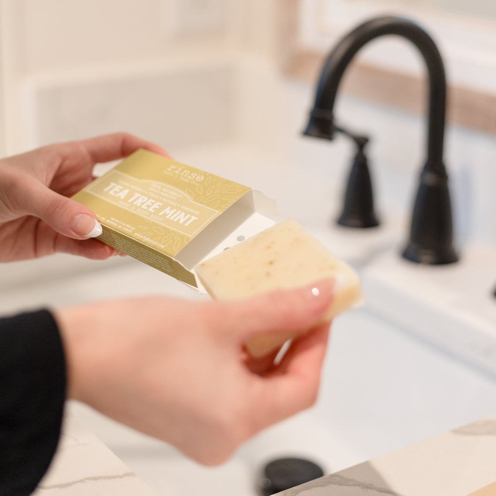 Mini bars are one of our bestselling gift items. Tea Tree Mint Soap Mini is affordable, beautifully scented, and a great Rinse introduction. Mix scents for a personalized sampler.