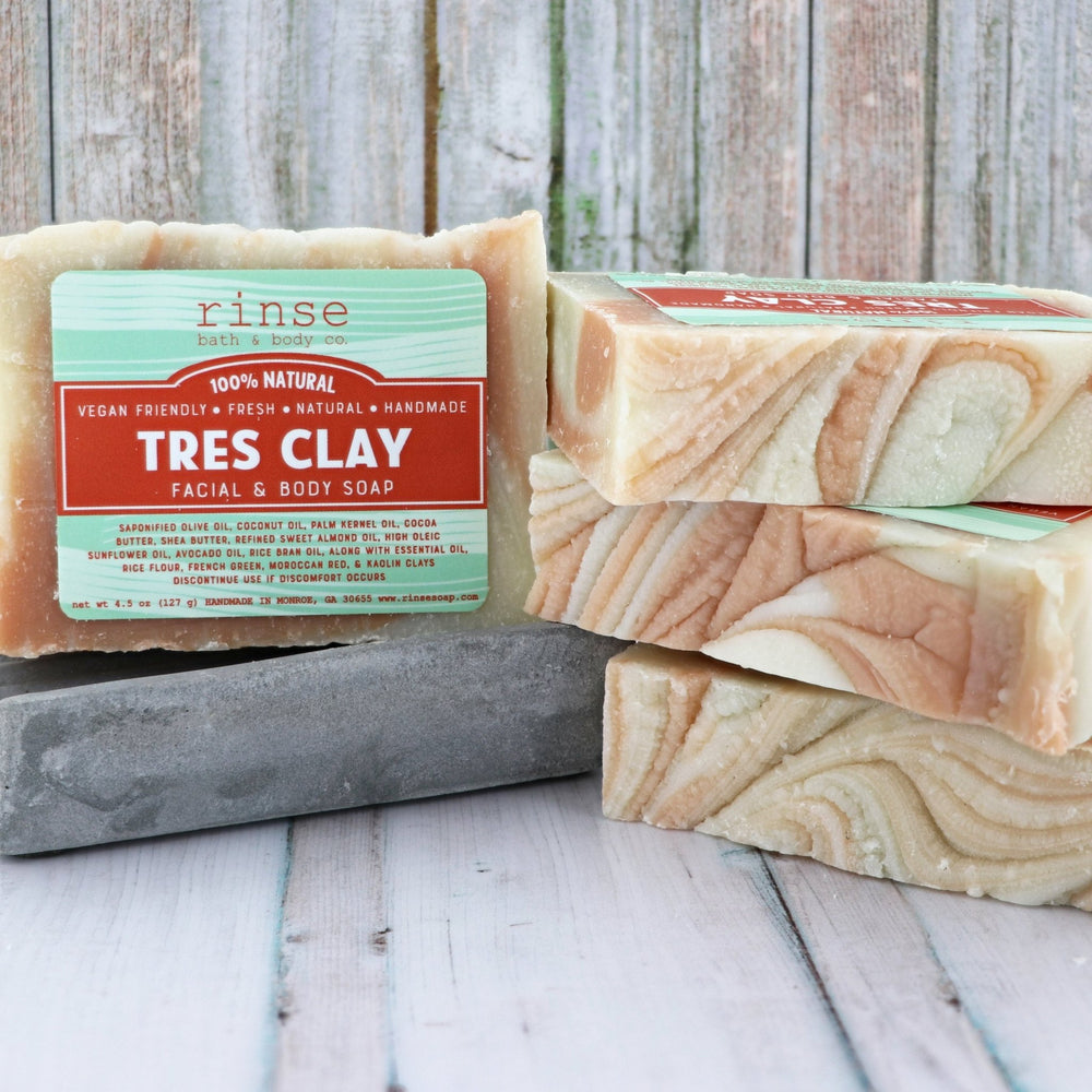 Rinse Bath & Body Co. makes Tres Clay Soap by hand using cold-process soapmaking that preserves natural glycerin. In this unique soap, French Green, Moroccan Red, and Kaolin clays work together with Cedarwood Essential Oil to gently cleanse and purify the skin. Our formula, featuring Rice Flour and Cedarwood Essential Oil creates a bar that cleans without leaving skin dry or tight.