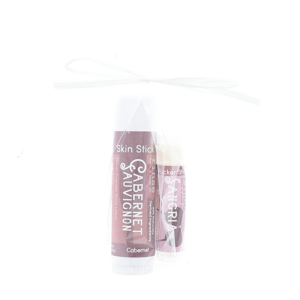 Gift Bundle Wine Pucker + Skin Stick is a curated set of complementary Rinse products. See the product listing for full contents. One Skin Stick & one Pucker Stick for a little giftable goodie!